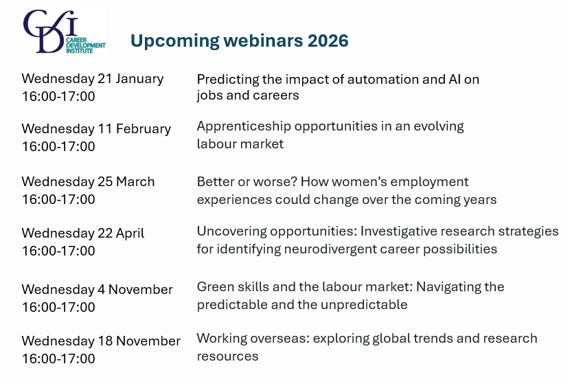 All with a focus on labour market information, there are some interesting topics to add to your CPD log, including automation and AI, apprenticeships, women and work, researching career possibilities for neurodivergent individuals, green skills, and global trends and resources.