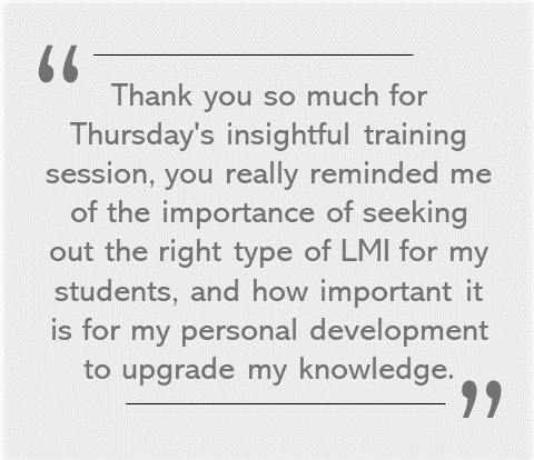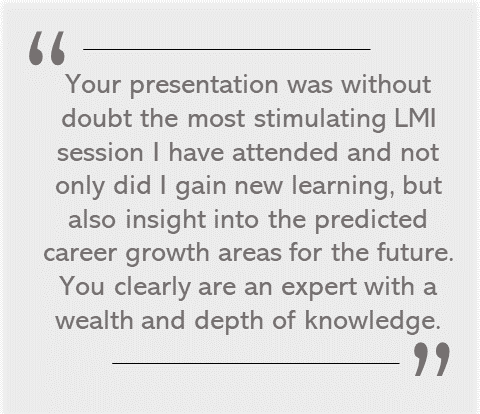 The session covered a comprehensive and current look at labour market information and future employment and skills trends appropriate to graduates. Helen gave a local, regional and national perspective on how labour market information can be utilised to support graduates in their job search and a knowledgeable insight into the current recruitment channels used by employers.